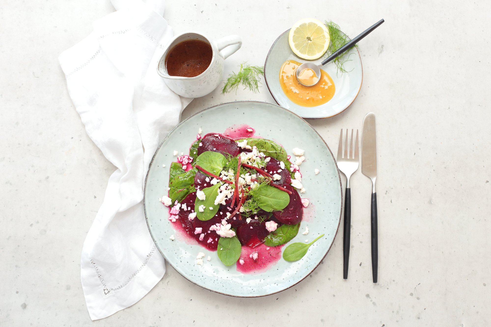 Špenátový salát z červené řepy s fetou, citronem a mánukou